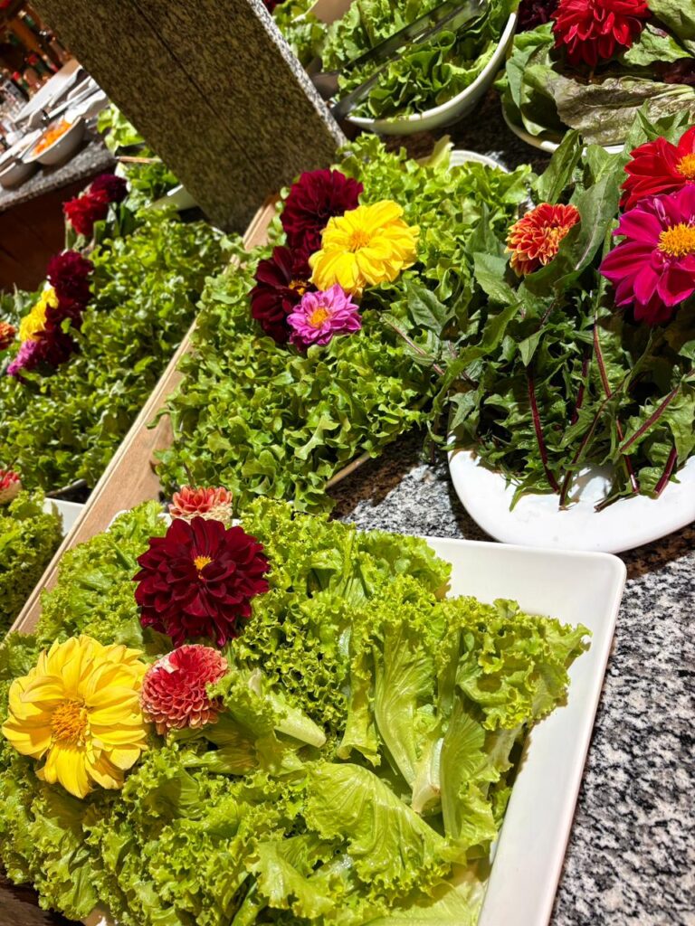 O buffet de saladas, super variado, com diversas opções frescas e bem preparadas, com verduras e legumes retirados da horta que fica no local, cuidadosamente disposto com flores da época, deixa tudo mais apetitoso.