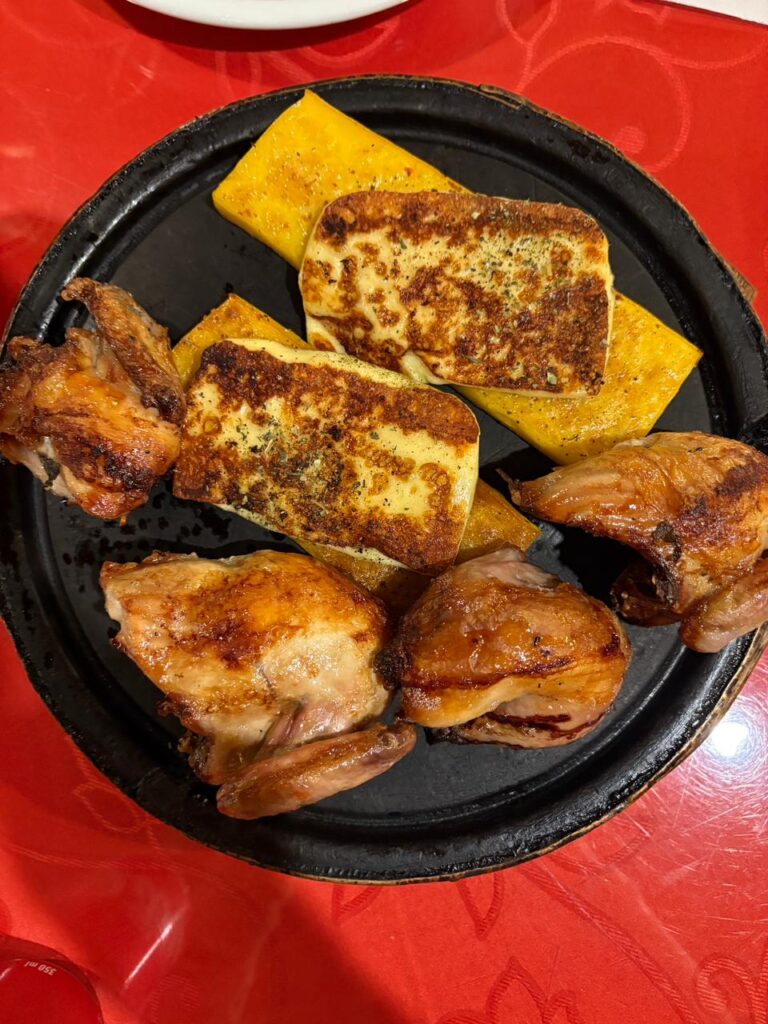 Um dos grandes diferenciais da casa está na forma de servir. O galeto, o queijo derretendo e a polenta brustolada (amo!) chegam à mesa em pedras quentes, mantendo tudo aquecido por mais tempo e garantindo sabor e textura especiais. Esse detalhe transforma a refeição em um momento ainda mais convidativo, quase um ritual de compartilhar a comida em família ou entre amigos. Ah! Tem também opções de trutas assadas com molhos especiais (essa parte eu pulo!).