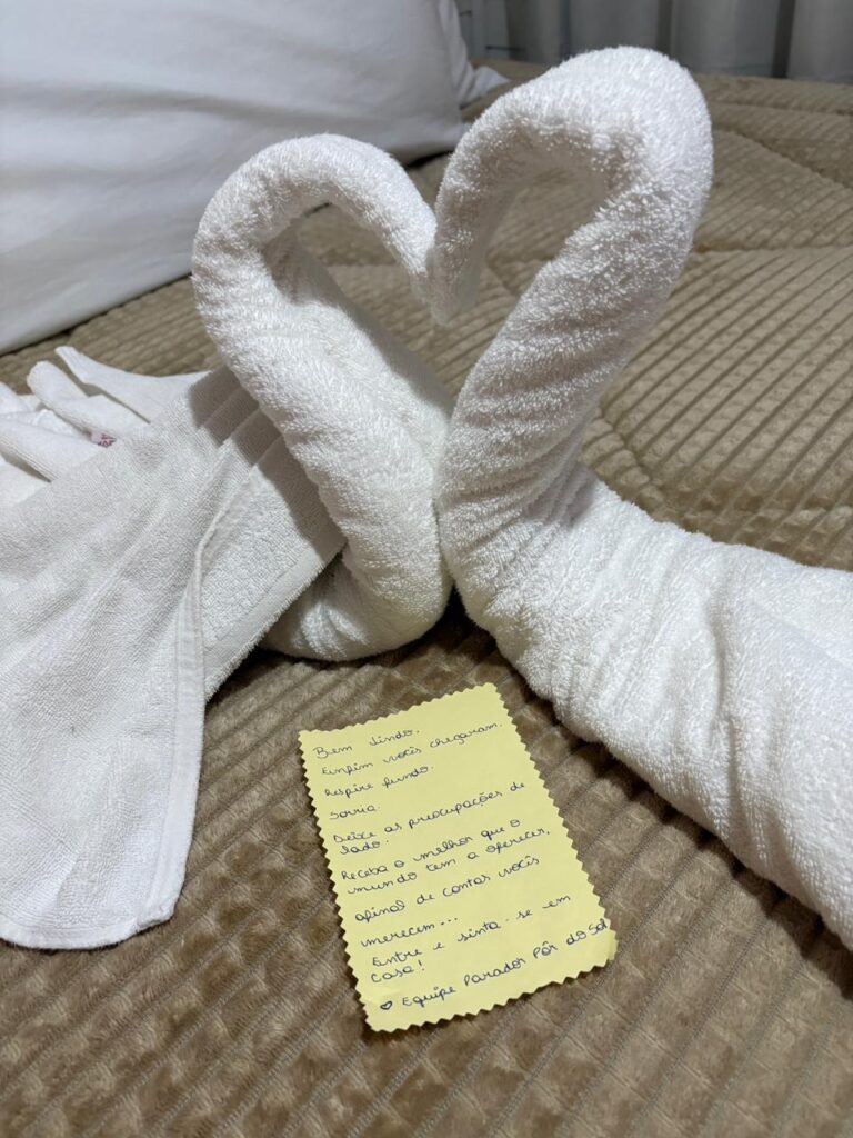 Nos hospedamos no Parador Pôr do Sol, pertinho do cânion Itaembezinho. Quando abrimos a porta da cabana, duas caminhas para as “meninas”, com cobertorzinho e bilhetinho. Para completar, pratinhos para água e ração. Já fiquei encantada na chegada.